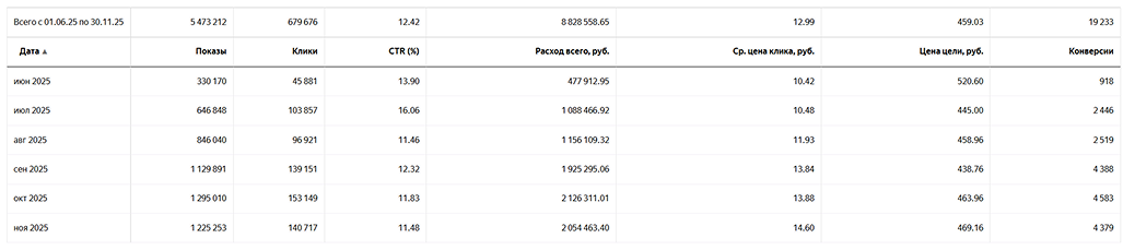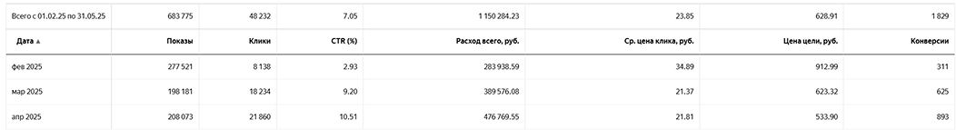 На помесячной статистике видно, что после оптимизации цена успешной оплаты стабилизировалась на уровне ниже 500 ₽ и удерживалась при росте объема конверсий.